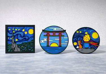 Cortes láser de alta precisión en triplay y acrílico. Diseños únicos para cuadros, llaveros y piezas personalizadas.